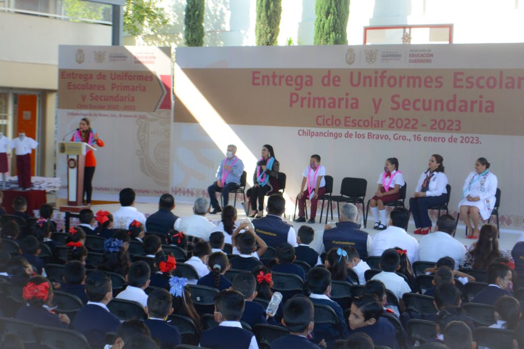 Chilpancingo, Gro., 16 de enero del 2023.-La gobernadora Evelyn Salgado Pineda, entregรณ uniformes escolares gratuitos a los alumnos de la escuela primaria Nicolรกs Bravo, ubicada en la colonia Obrera de la capital del estado. Acompaรฑada del secretario de educaciรณn Marcial Rodrรญguez Saldaรฑa y la presidenta municipal Norma Otilia Hernรกndez Martรญnez, se realizรณ la entrega a los alumnos de primer aรฑo hasta sexto grado.