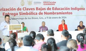 Junto con el secretario de Educación Guerrero, Marcial Rodríguez Saldaña, la gobernadora entregó nombramientos simbólicos a maestras y maestros de los municipios de Malinaltepec, Cochoapa el Grande, San Luis Acatlán, Copanatoyac, Tlapa, Zapotitlán Tablas, Atlamajalcingo del Monte, Xochistlahuaca, Tlacoapa, Zitlala, Olinalá, Iliatenco, Atlixtac, Iguala, Ayutla, Quechultenango y Eduardo Neri.