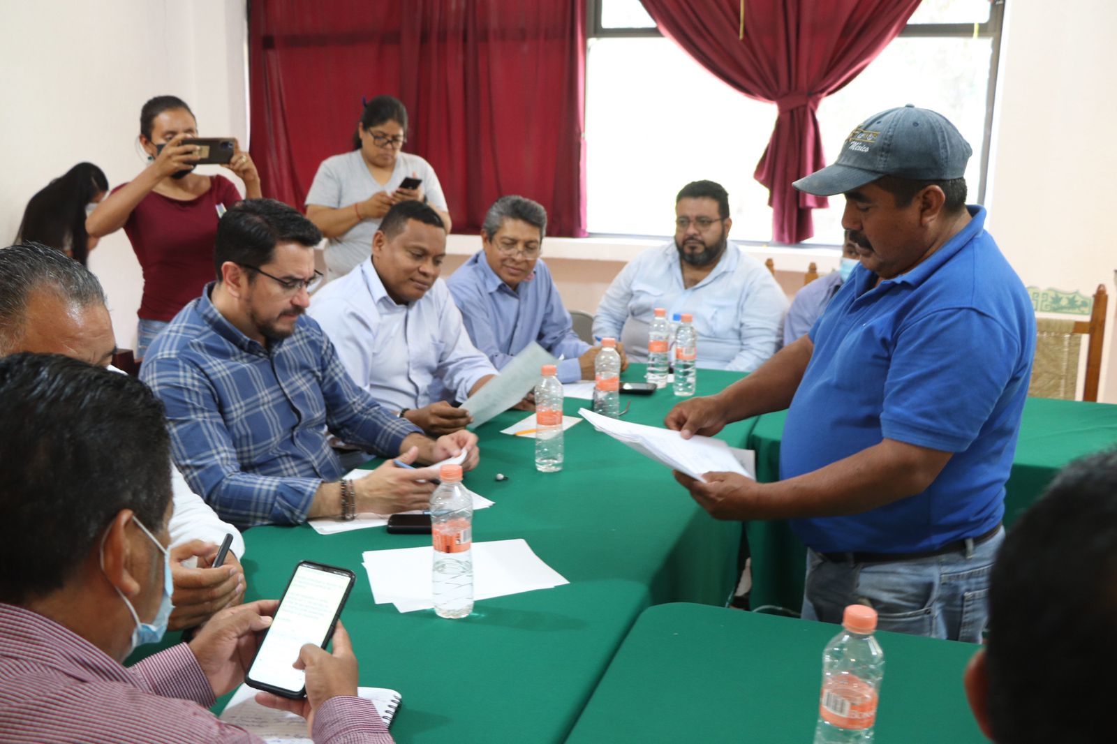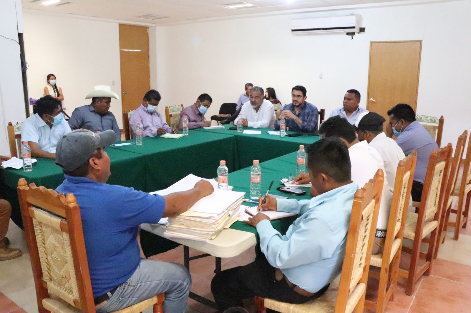 Tlapa de Comonfort, Gro., 19 de junio de 2022.- Con el objetivo de colaborar en la toma de acuerdos y propuestas en la ruta de la conciliación de las comunidades, el secretario general de Gobierno, Ludwig Marcial Reynoso Núñez, encabezó una mesa de diálogo con una comisión de 26 comisarios ejidales, encabezados por Zenaido Cano Galindo y Rogelio Galindo García, presidente y secretario respectivamente, del Comisariado de Bienes Comunales de Alacatlatzala, perteneciente al municipio de Malinaltepec.