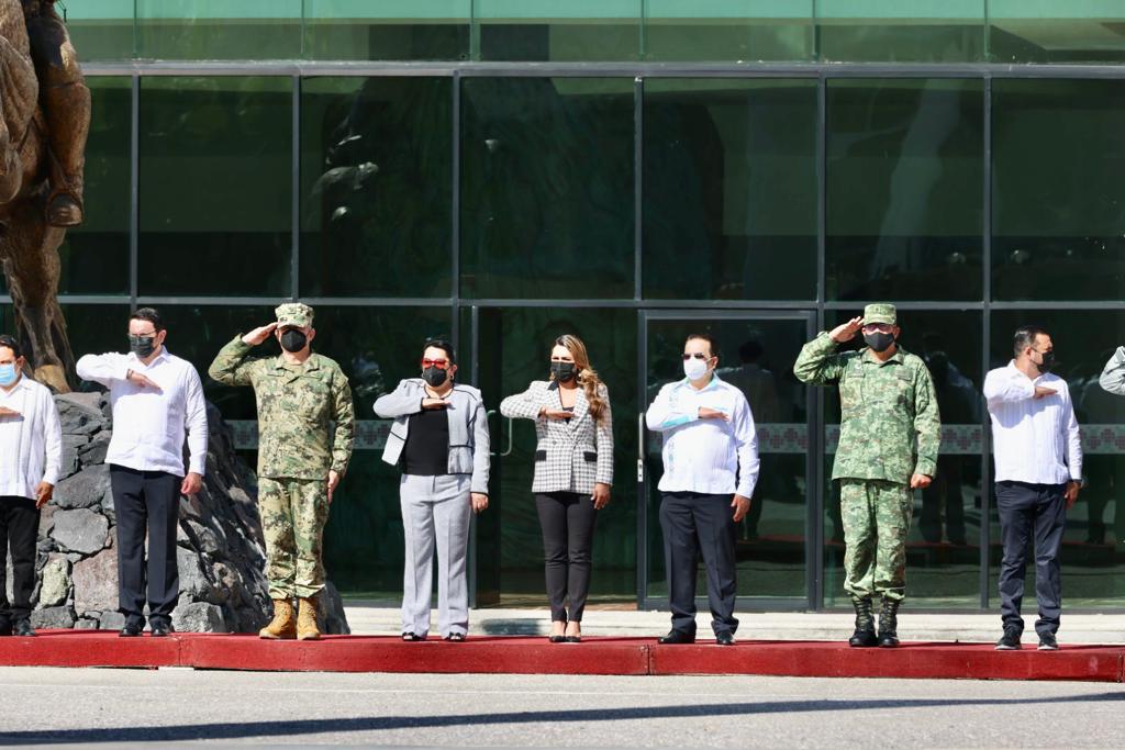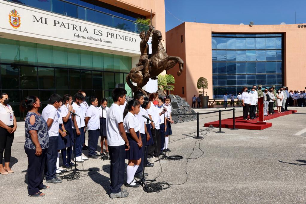 Durante la ceremonia cívica, niñas y niños de la Escuela Primaria Bilingüe “Conetcalli” interpretaron en Náhuatl la canción “El elefante” como parte del programa oficial, donde la gobernadora junto con los titulares del Poder Legislativo y Judicial, realizaron el izamiento de la Bandera Monumental en la explanada de la sede del Poder Ejecutivo en Guerrero.