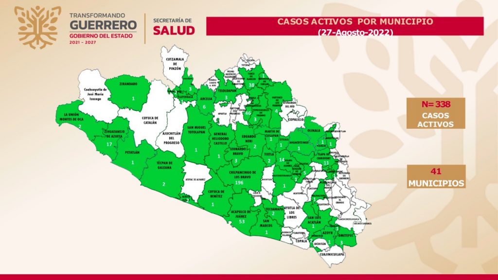 La dependencia estatal detalló que desde el inicio de la pandemia, Guerrero acumula 115,474 casos confirmados y 6,827 defunciones, ocupando el lunar 27 a nivel nacional en incidencia de casos activos, que se ubican en 41 municipios, entre ellos Chilpancingo, con 96; Acapulco, 53; Iguala, 46; Taxco, 38; Zihuatanejo, 17; Chilapa, 14; Tlapa, 11; Arcelia, 6; Atlixtac, 5, y Huitzuco, 4.