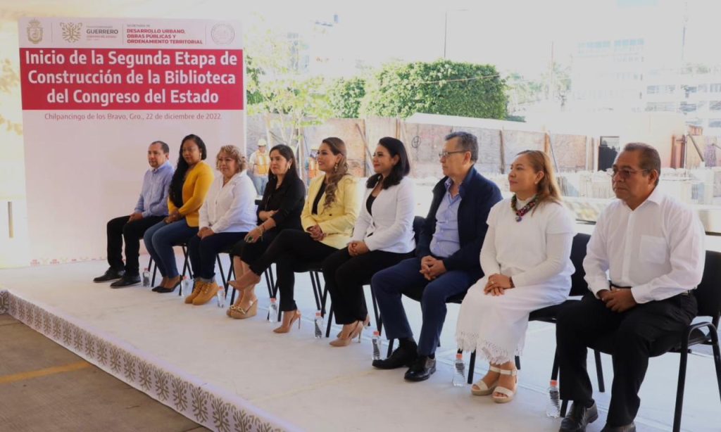 En la sede del Poder Legislativo, con las presidentas de la Junta de Coordinación Política, Yoloczin Domínguez Serna y de la Mesa Directiva del Congreso del Estado, Yanelli Hernández Martínez, así como legisladores de diversas fracciones parlamentarias, la gobernadora Evelyn Salgado, dio el banderazo de inicio de obra de la segunda etapa de Construcción de la Biblioteca en la sede del poder legislativo del estado.
