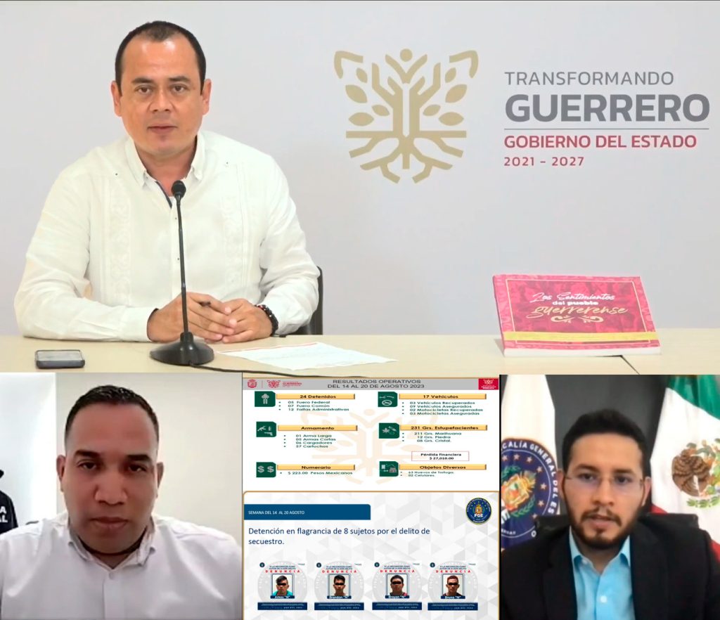 Chilpancingo, Gro., 21 de agosto de 2023. – Resultado de los operativos y acciones que en materia de seguridad y procuración de justicia se realizan en Guerrero desde la Mesa de Coordinación para la Construcción de la Paz, se logró la detención en flagrancia de ocho sujetos por el delito de secuestro, relacionados con la célula criminal de “Los Rusos” que operaba en el Puerto de Acapulco.