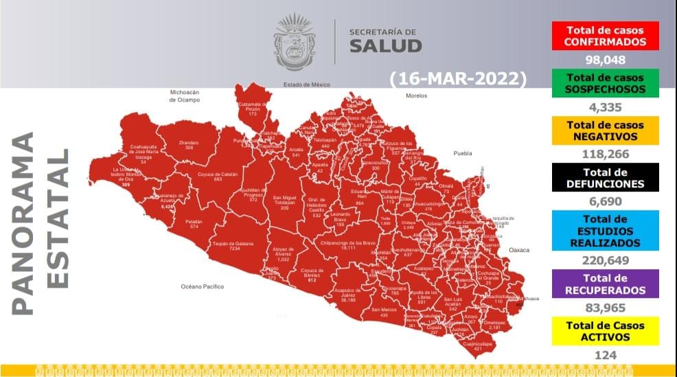 Chilpancingo, Gro., 16 de marzo del 2022.- De acuerdo al reporte diario “Covid-19 Guerrero”, la Secretaría de Salud estatal confirmó 20 contagios y 1 defunción en las últimas 24 horas, y un total de 124 casos activos de Covid-19, que ubica a la entidad en el lugar número 28 a nivel nacional.