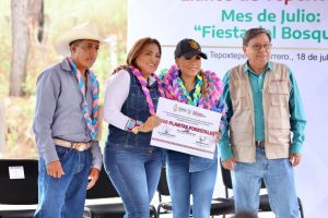 Acompañada por pobladores de Llanos de Tepoxtepec, la gobernadora entregó de manera simbólica un vale de 750 plantas al Comisario Municipal Pedro Cástulo García y otro vale por mil 500 ejemplares de plantas a la alcaldesa de Eduardo Neri, Sara Salinas Bravo.