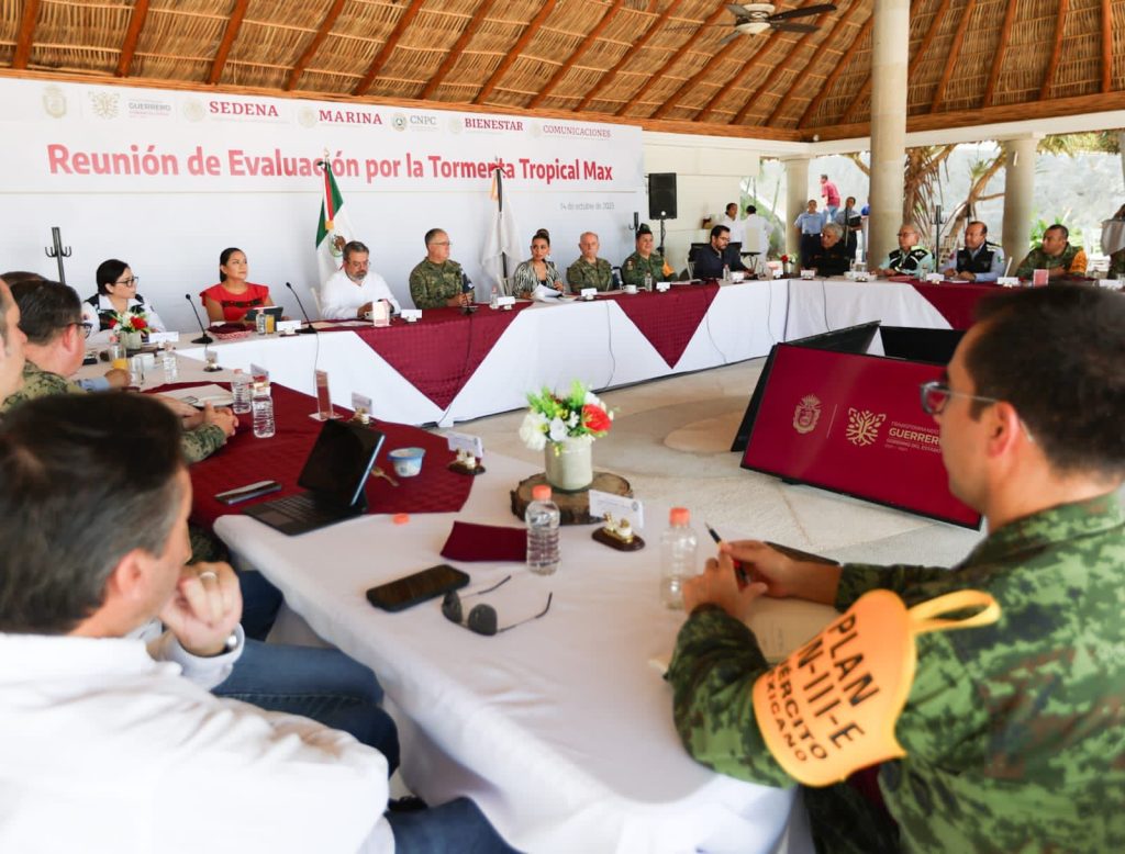 Acapulco, Gro., 14 de octubre de 2023.- La gobernadora Evelyn Salgado Pineda junto con los titulares de la Coordinación Nacional de Protección Civil, Laura Velázquez Alzúa; del Bienestar, Ariadna Montiel Reyes; de la Secretaría de Infraestructura, Comunicaciones y Transportes, Jorge Nuño Lara, así como representantes de la Secretaría de Marina y de la Defensa Nacional, encabezaron la reunión de evaluación por los daños ocasionados por la tormenta tropical Max.
