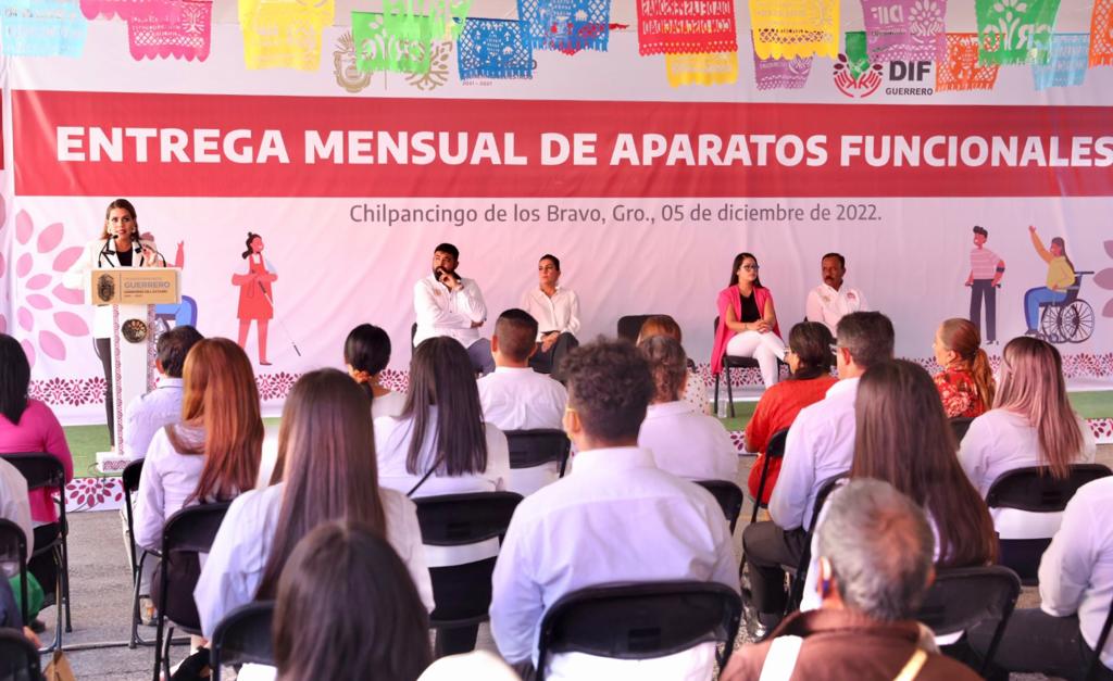 Chilpancingo, Gro., 05 de diciembre del 2022.- Con la convicción de trabajar por un estado más justo, igualitario y equitativo con justicia social, la gobernadora Evelyn Salgado Pineda y la presidenta del Sistema Estatal DIF, Liz Salgado Pineda, encabezaron la entrega mensual de aparatos funcionales en el marco del “Día Internacional de las Personas con Discapacidad”, beneficiando a más de 600 personas de las regiones Costa Chica, Centro, Acapulco y Costa Grande con una inversión de 1.8 millones de pesos, sumando durante este 2022 más de 2 mil apoyos entregados en todas las regiones de Guerrero.