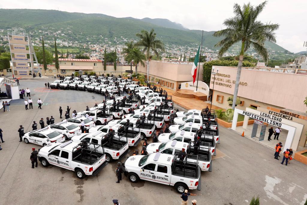 Con una inversión de 215 millones de pesos, la mandataria estatal entregó a la Secretaría de Seguridad Pública de Guerrero, un total de 72 patrullas nuevas, 8 mil 826 uniformes completos, 190 equipos de protección, 240 cascos y 240 chalecos balísticos, así como 92 equipos de radio comunicación, además de 40 computadoras para la Universidad Policial del Estado.