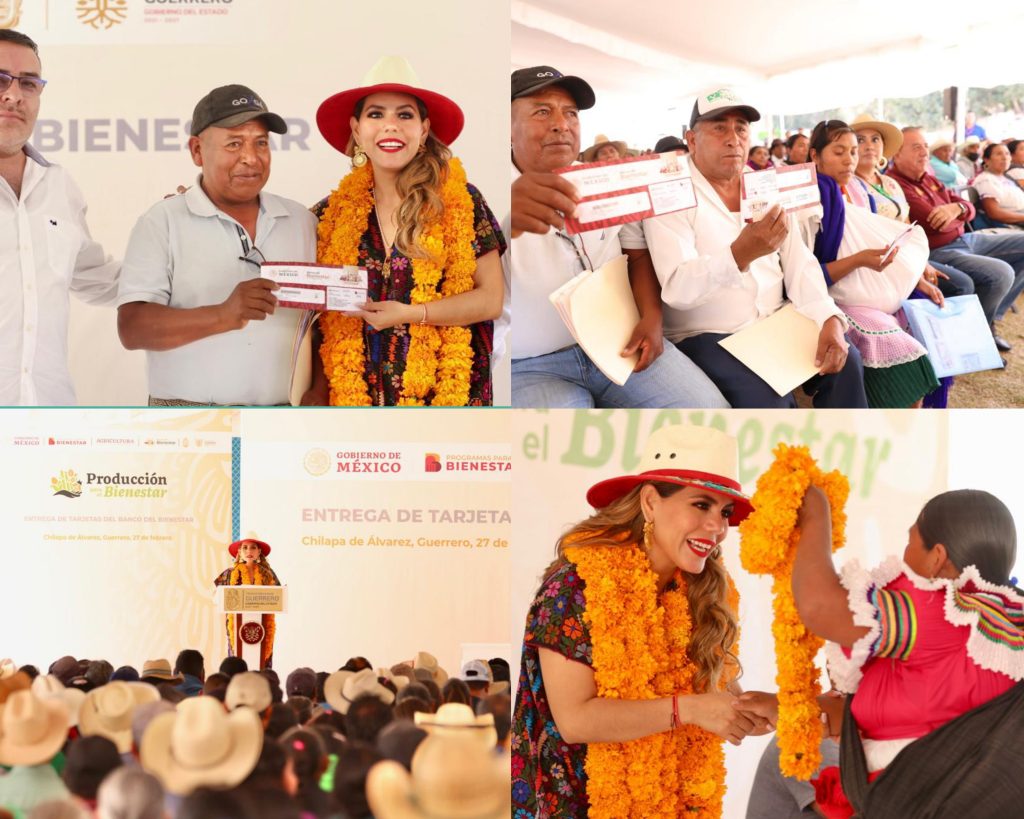 Chilapa de Álvarez, Gro., 27 de febrero del 2023. – La gobernadora Evelyn Salgado Pineda y el delegado de los programas sociales en Guerrero Iván Hernández Díaz encabezaron la entrega de tarjetas de banco del Programa “Producción para el Bienestar”, con el objetivo de fortalecer la autosuficiencia alimentaria en beneficio directo a más de 164 mil mujeres y hombres campesinos que producen en una superficie de 378 mil hectáreas del territorio estatal con una inversión federal anual de 982 millones de pesos.