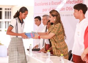 “Otis se llevó nuestros libros y uniformes, pero no se llevó nuestros deseos de seguir preparándonos y estudiando en las aulas para ser en el futuro ciudadanos ejemplares que tanto necesita la sociedad. El día de hoy con estos apoyos que trae para nuestras escuelas, uniformes y libros, nos anima y nos compromete como estudiantes a dar el mayor de nuestros esfuerzos en las aulas y cumplir con la parte que nos corresponde, para hacer de este maravilloso estado de Guerrero, un mejor lugar para vivir”, agregó.