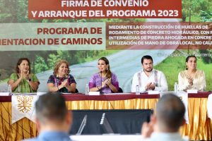 Chilpancingo, Gro., 24 de abril del 2023. – Por segundo año consecutivo derivado de la gestión en favor de los pueblos indígenas de Guerrero, la gobernadora Evelyn Salgado Pineda firmó un convenio de coordinación con alcaldesas y alcaldes de 23 municipios de La Montaña y parte de la Costa Chica, para dar arranque al Programa de Pavimentación de Caminos Rurales 2023 que representa una inversión de mil 84 millones de pesos, como fue el compromiso del presidente Andrés Manuel López Obrador con Guerrero.