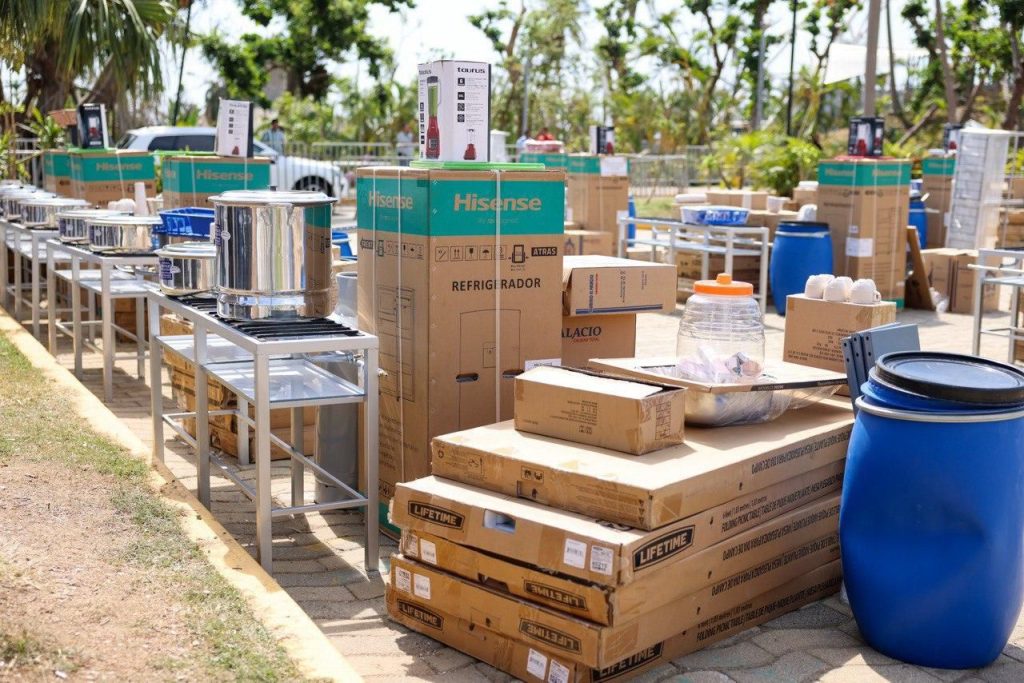 Los paquetes para las escuelas incluyen fogón de gas de cuatro quemadores, regulador de dos vías, 50 platos lisos, 50 vasos, 50 tazas, 50 cucharas soperas, 50 tazones aveneros, licuadora, dos cucharas de servicio, estante, escurridor, dos tanques de gas de 20 kilogramos, dos cuchillos tipo chef, dos cucharones, dos palas volteadoras, arrocera, vaporera, refrigerador de 7 pies, colador, cinco mesas plegables con asientos, un tambo de 120 litros con tapa, vitrolero, tarja metálica, sartenes, comal de lámina reforzada, entre otros. Haciendo un total de 286 artículos.