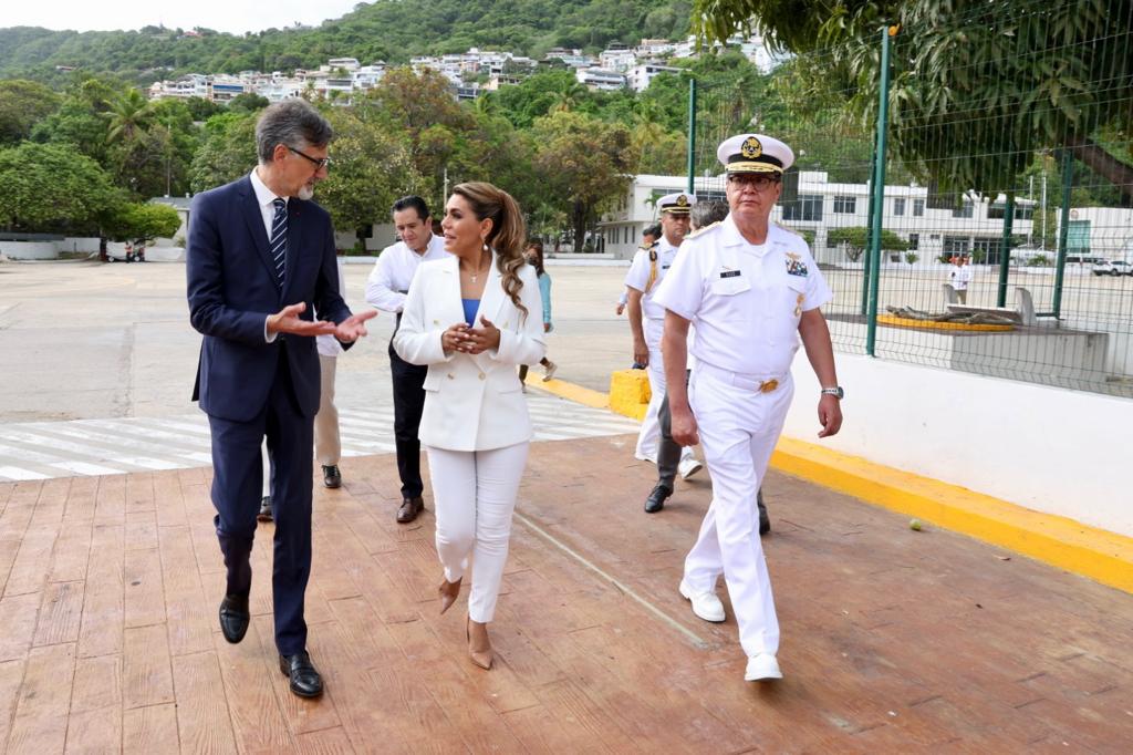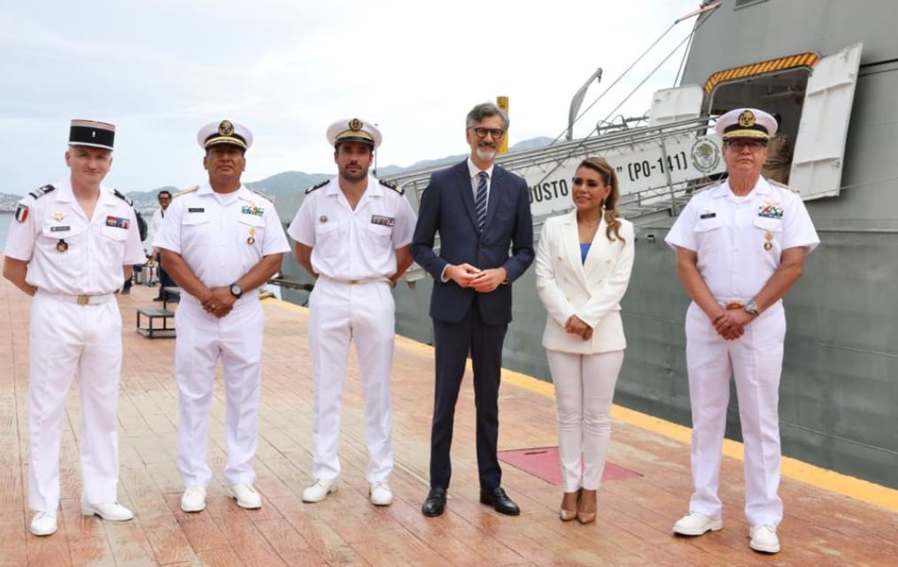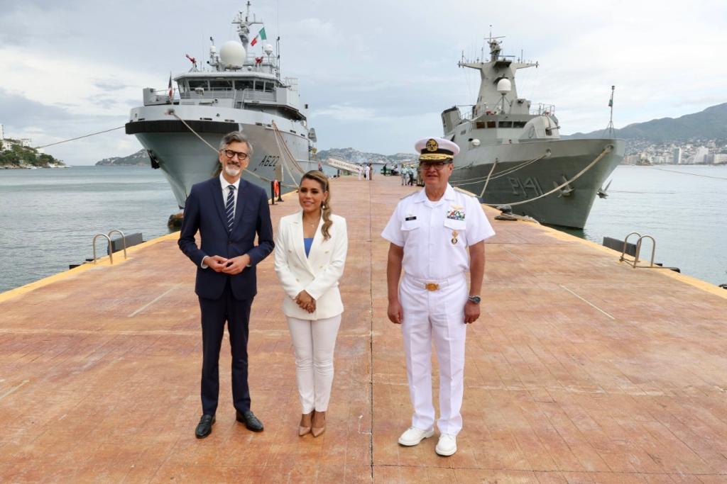 La reunión se celebró en las instalaciones de la Octava Región Naval en Acapulco, donde la gobernadora Evelyn Salgado y el diplomático francés Jean Pierre, realizaron un recorrido por el muelle de la Base Naval, donde saludó y dio la bienvenida a los tripulantes del Buque de apoyo y asistencia de ultramar francés “Bougainville”, quienes realizan una escala en el puerto de Acapulco, para continuar en su ruta de navegación.