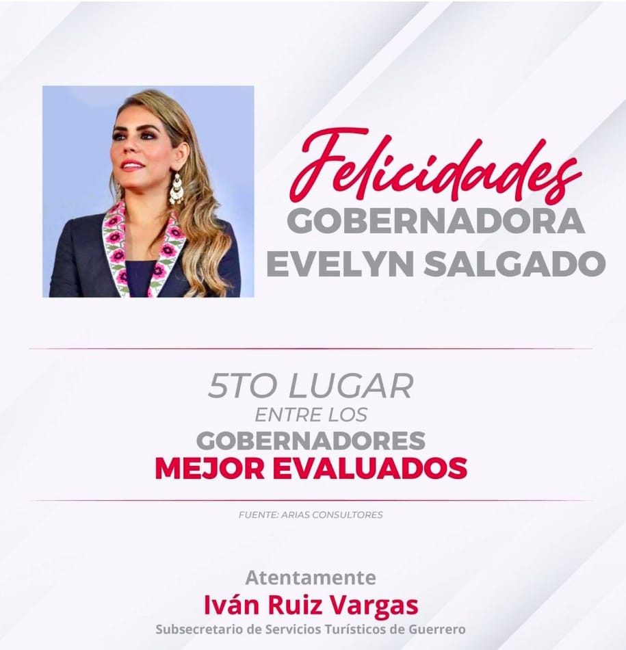 Gracias a su trabajo y por resultados obtenidos en beneficio de la población guerrerense en sus primeros seis meses de gobierno, Evelyn Salgado Pineda se se mantiene como uno de los gobernantes mejor evaluados a nivel nacional al contar con un alto porcentaje de aprobación ciudadana.