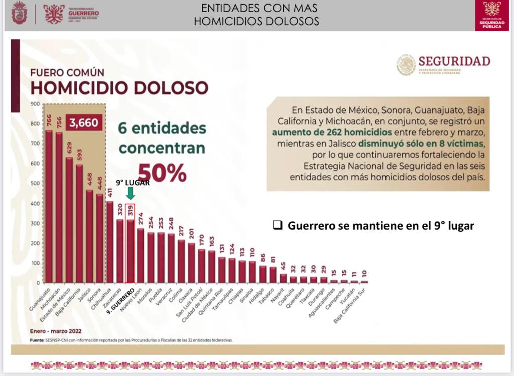 Chilpancingo, Gro., 20 de abril de 2022.- Como resultado del trabajo permanente en materia de seguridad pública y procuración de justicia Guerrero se ubica en el noveno lugar a nivel nacional en homicidios dolosos.