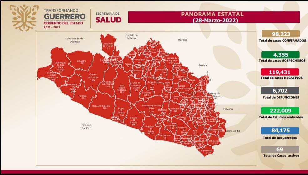 Agregó que de acuerdo al informe “Covid-19 Guerrero”, desde el inicio de la pandemia, se acumulan en la entidad 98,223 casos confirmados y 6,702 defunciones por Covid-19, y que a nivel nacional se registran 9,278 casos activos, ubicándose el estado de Guerrero en el lugar 29, con 69.