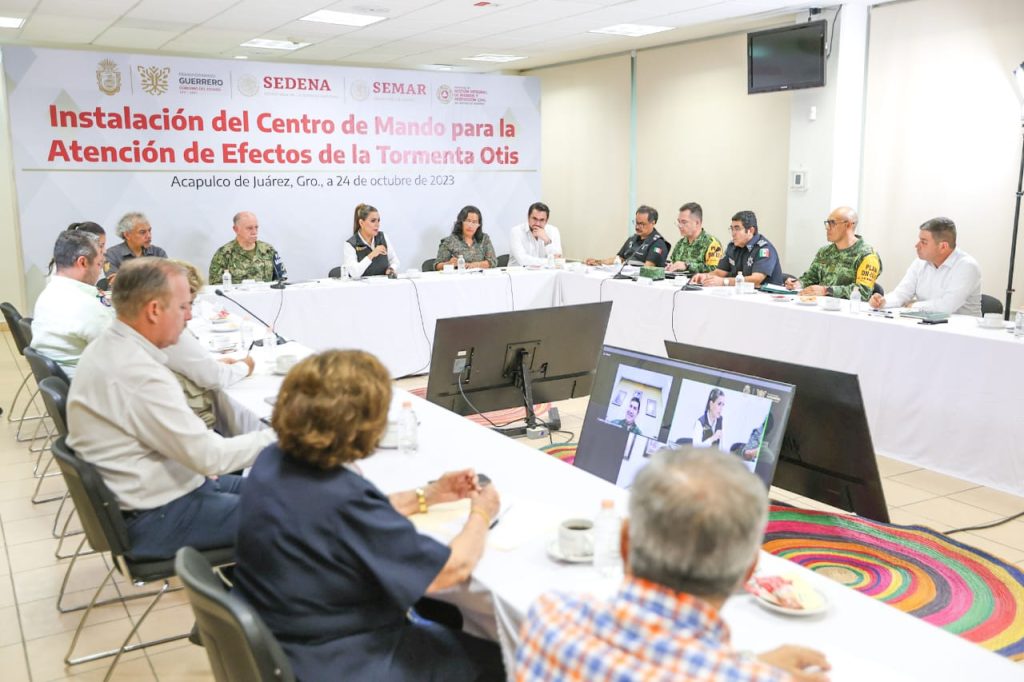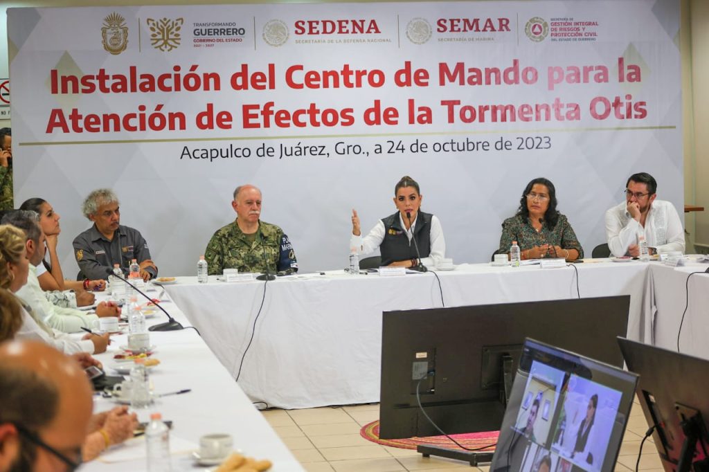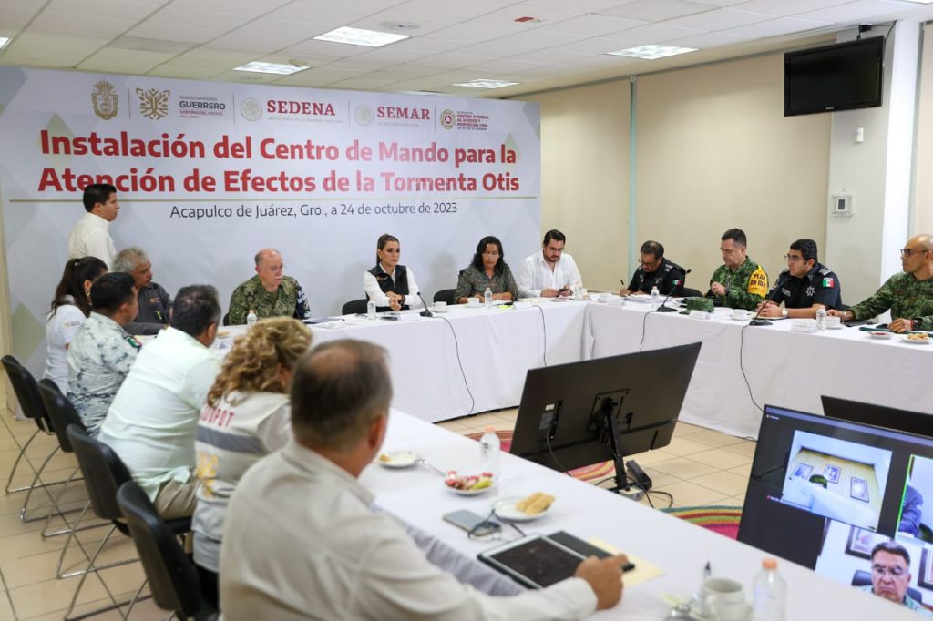 Acapulco, Gro., 24 de octubre de 2023.- La gobernadora Evelyn Salgado Pineda encabezó la instalación del Centro de Mando para la Atención de los Efectos del Huracán “Otis”, en el cual participan los tres niveles de gobierno en revisión a las acciones y estrategias de prevención, atención y mitigación ante el posible impacto en costas guerrerenses de este fenómeno meteorológico. De acuerdo con el pronóstico, se prevé que pueda tocar tierra entre los municipios de Acapulco y Tecpan de Galeana.