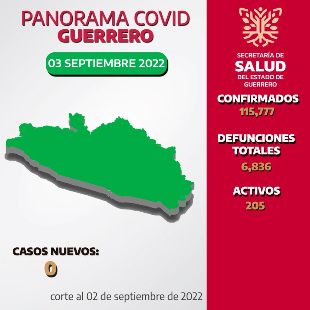 En el informe técnico diario de COVID-19 señala que desde el inicio de la epidemia Guerrero acumula 115,777 casos confirmados y 6,836 defunciones, el estado se ubica en el lugar 26 en incidencia de casos activos a nivel nacional.