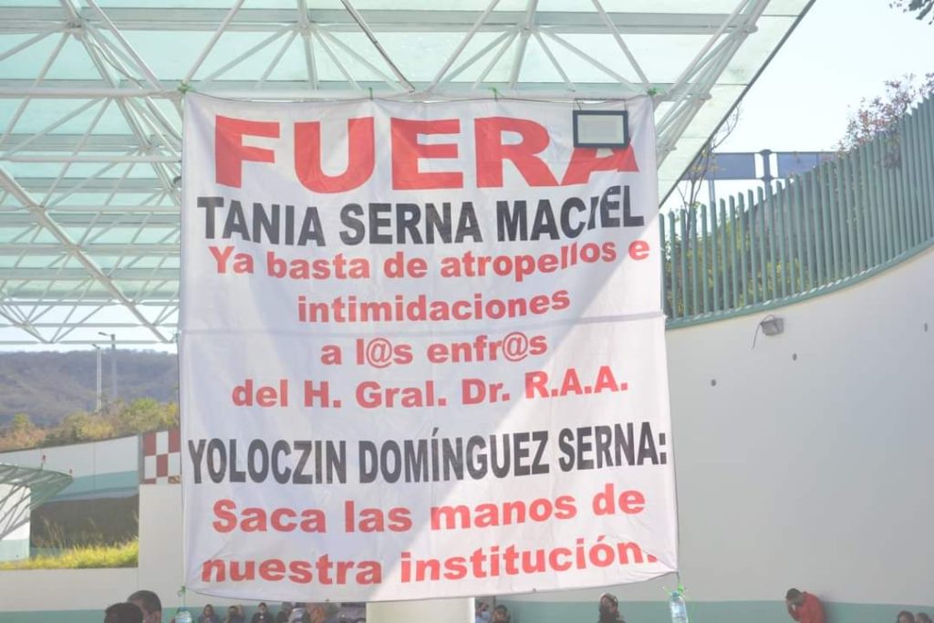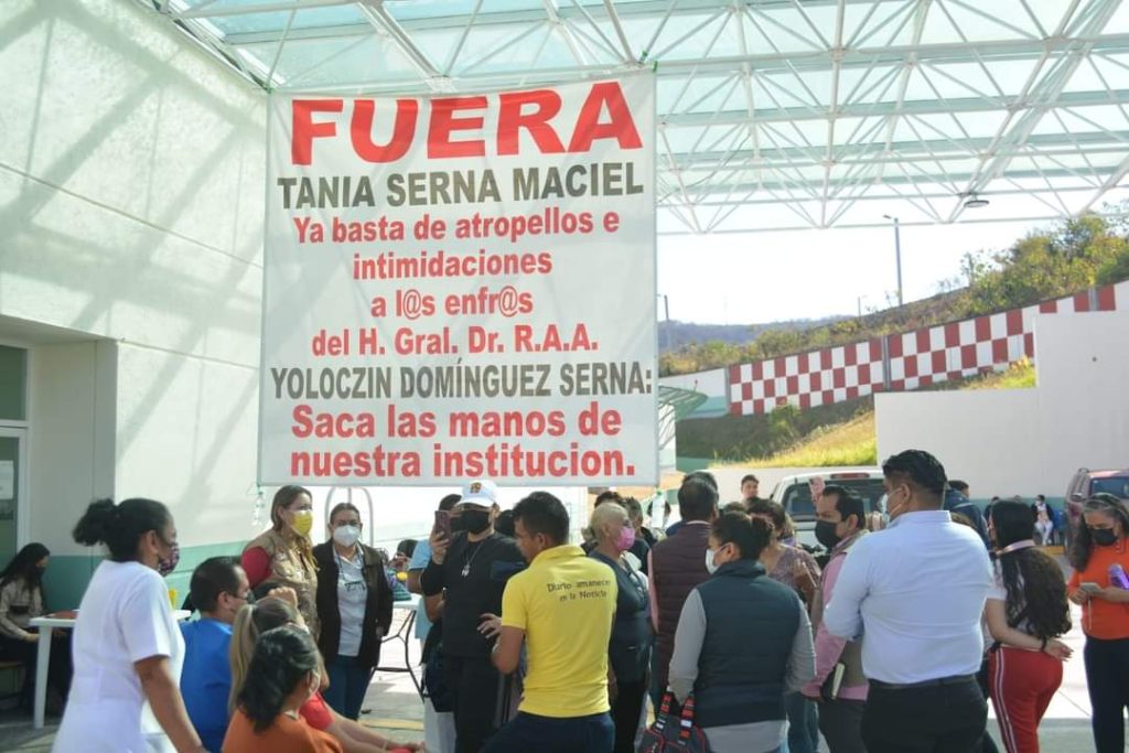 Chilpancingo, Gro., 25 de enero del 2023.- Por culpa de la diputada local y presidenta de la (JUCOPO) Yoloczin Domínguez Serna, el cuerpo de enfermeras y trabajadores del hospital General Raymundo Abarca Alarcón, bloquean las entradas del hospital para exigir la destitución de la jefa de enfermeras Tania Serna Maciel, los inconformes afirmaron que la diputada local por Morena, la protege y la impuso en ese hospital sabiendo que de su parte impera el acoso laboral y represiones.