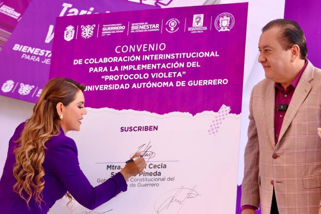 En este evento, la gobernadora Evelyn Salgado firmó un convenio de colaboración con el rector de la Universidad Autónoma de Guerrero, Javier Saldaña Almazán, para implementar acciones conjuntas que fortalezcan el desarrollo del Protocolo Violeta en la máxima casa de estudios y difundir los componentes del programa entre la comunidad universitaria.
