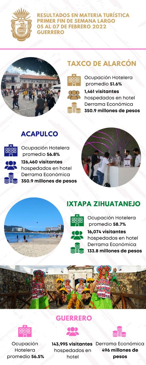 De acuerdo a datos de la dependencia estatal, estos tres días de asueto dieron como resultado una ocupación hotelera promedio del 56.5 por ciento; y en la información por destinos turísticos, el reporte indica que Taxco de Alarcón, registró un 51.6 por ciento de ocupación hotelera promedio, una derrama económica estimada de 11.2 millones de pesos y una afluencia de 1,461 visitantes hospedados en hotel.