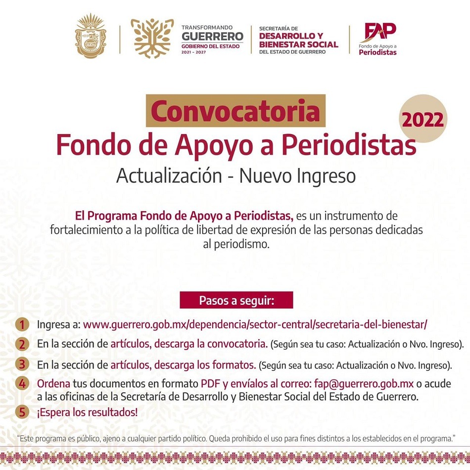 Chilpancingo, Gro., 23 de Abril de 2022.- Fortaleciendo la política de respeto a la libertad de expresión de las personas que ejercen el periodismo, el Gobierno del Estado a través de la Secretaría de Desarrollo y Bienestar Social, lanzó las convocatorias para actualización y nuevo ingreso del Programa Fondo de Apoyo a Periodistas (FAP), el cual va dirigido a quienes ejercen el periodismo en radio, televisión, prensa escrita y plataformas digitales de noticias (sitios web).