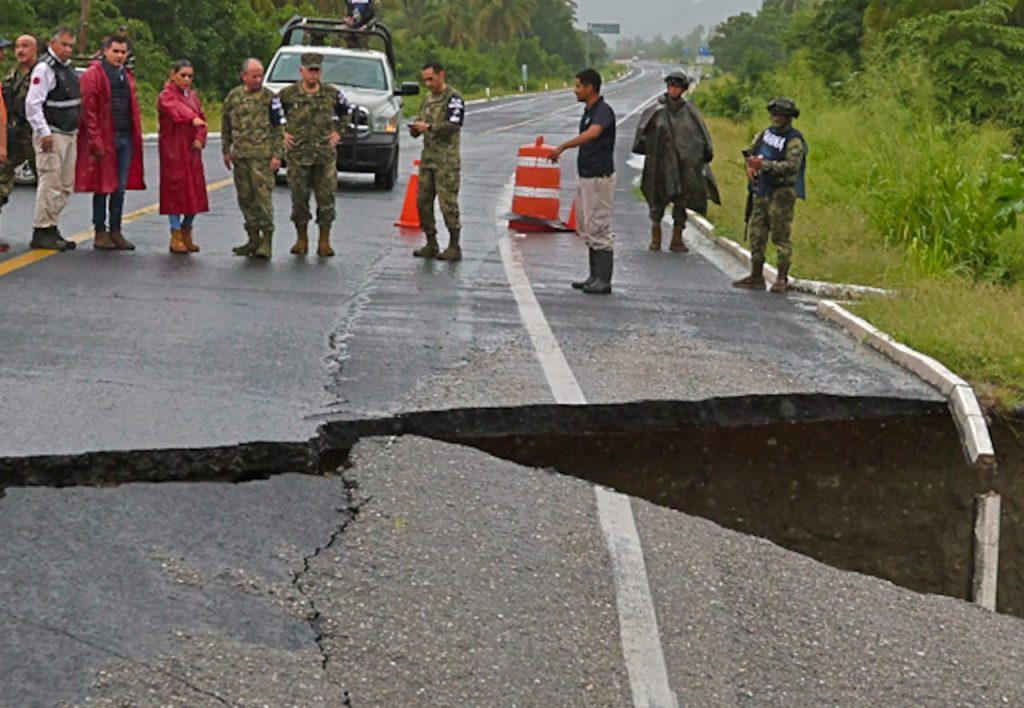En este punto del recorrido, el delegado en Guerrero de la Secretaría de Comunicaciones y Transportes, Ricardo Alarcón Abarca informó que hay dos cortes en la carretera Acapulco-Zihuatanejo, uno en el kilómetro 198 +740 en donde de manera previa se estaba construyendo un puente y actualmente se trabaja para restaurar el terraplén. Y el otro, en el kilómetro 111+300, en donde hay un corte aproximado de 2.50 metros de longitud y una profundidad de casi 3 metros. En ambos casos se trabaja para lograr resarcir el daño y se estima que en dos o tres días, dependiendo de las condiciones climatológicas, puedan rehabilitarse los tramos carreteros.