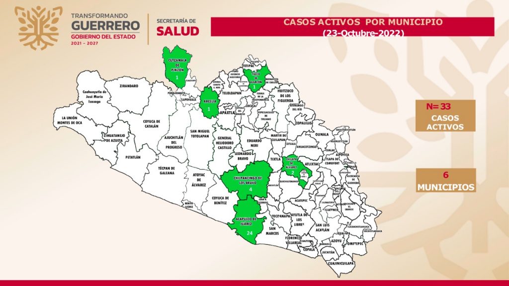 La entidad ocupa el lugar 27 a nivel nacional en casos activos, distribuidos en 6 municipios: Acapulco, 24; Chilpancingo, 4; Chilapa, 2; Arcelia, 1; Cutzamala de Pinzón, 1; y Taxco, 1.