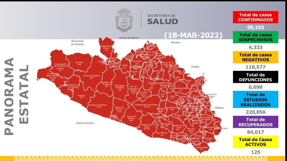 Chilpancingo, Gro., 18 de marzo de 2022.- La Secretaría de Salud informó que en la entidad hay 125 casos activos de COVID-19, y que en las últimas 24 horas se registraron 18 contagios y 4 defunciones.
