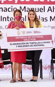 De manera simbólica se entregaron paquetes de equipamiento para panadería tradicional, molinos para nixtamal y elaboración de tortillas, triciclos de carga y venta de productos, carritos para venta de Hot Dog y hamburguesas, material para venta de antojitos, juegos de manicure, elaboración de botanas y frituras y equipos para costura, entre otros apoyos.
