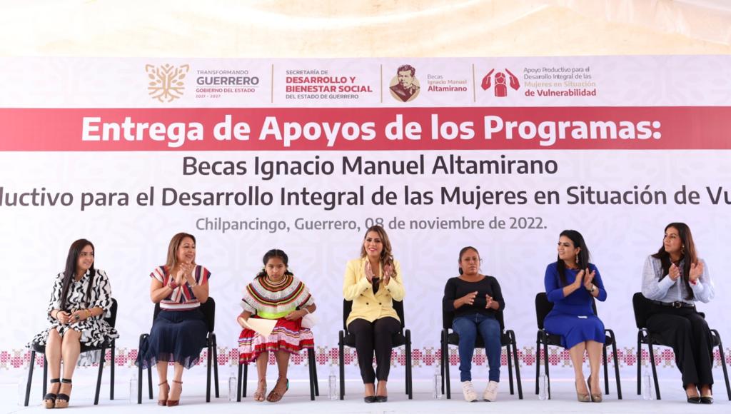 Chilpancingo, Gro., 08 de noviembre de 2022. – Para seguir transformando Guerrero, con una inversión superior a los 4.8 millones de pesos, la gobernadora Evelyn Salgado Pineda, encabezó la entrega de apoyos productivos para el desarrollo integral de las mujeres en situación de vulnerabilidad y del programa de becas “Ignacio Manuel Altamirano” a estudiantes de nivel básico de la zona Centro, como resultado del ejercicio transparente y de austeridad en los recursos públicos del estado.