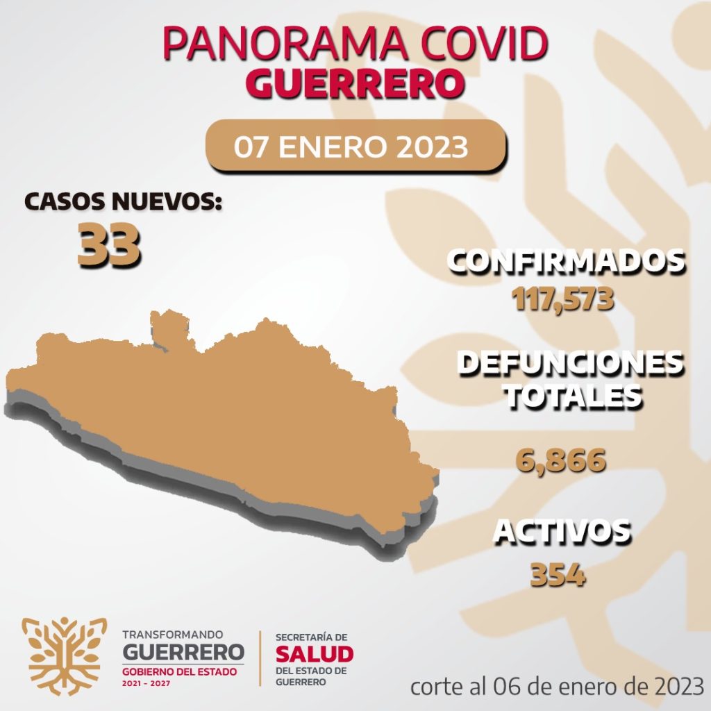 Chilpancingo, Gro., 07 de enero 2023.- La Secretaría de Salud Guerrero (SSG) informó que al 06 de enero se registran 354 casos activos de Covid-19, de los cuales 33 se confirmaron en las últimas 24 horas.