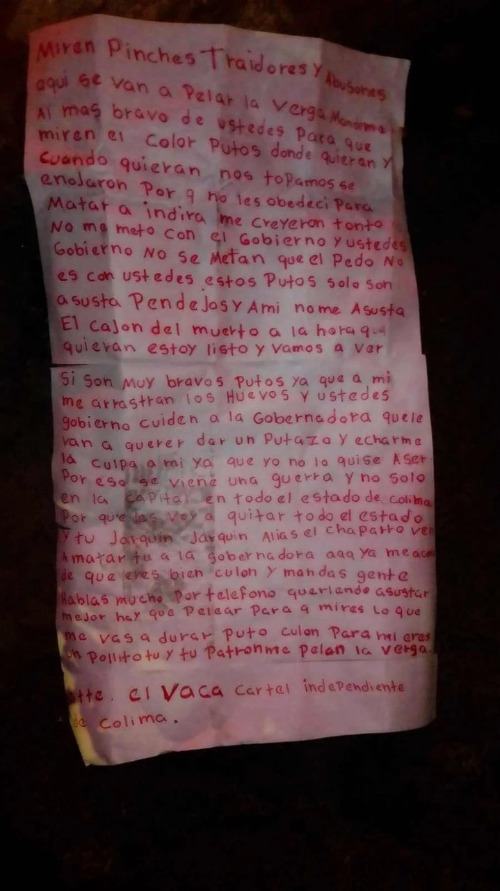 “Ustedes gobierno cuiden a la Gobernadora que le van a querer dar un putazo y echarme la culpa a mi ya que yo no lo quise Aser Por eso se viene una guerra y no solo en la capital en todo el estado de Colima Por que les voy a quitar todo el estado (sic)”, se leía en letras rojas.