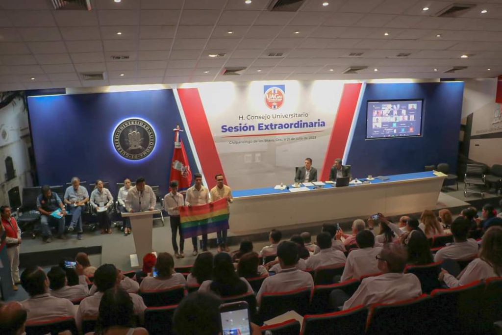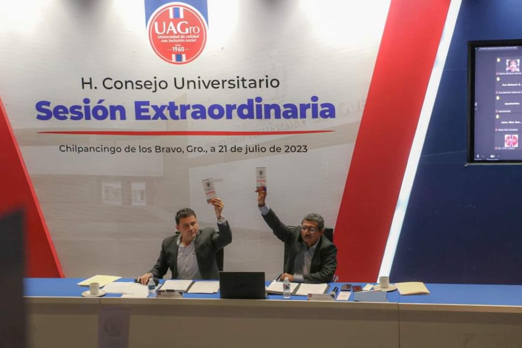 Chilpancingo, Gro., 22 de julio del 2023.- Esta mañana se llevó a cabo la Sesión Extraordinaria del H. Consejo Universitario de la #UAGro donde se aprobó la creación de cuatro nuevos doctorados, tres maestrías y la reestructuración de cuatro programas educativos de cara al nuevo ciclo escolar 2023-2024; así mismo y por decisión unánime el máximo órgano de gobierno aprobó que el nombre de Mtro. Ulises Salvador Nava Juárez se inscriba en el Memorial Universitario y se pidió justicia por su asesinato en Aguascalientes.