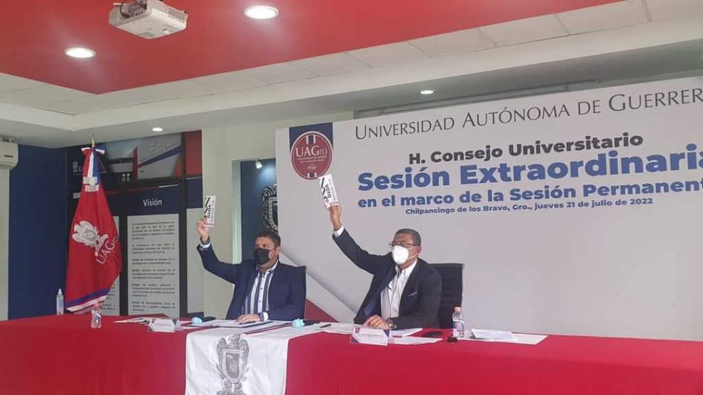 Chilpancingo, Gro. 21 de julio, 2022.- Este jueves, el pleno H. Consejo Universitario de la Universidad Autónoma de Guerrero aprobó por votación unánime las extensiones de la Licenciatura en Gestión Turística en la ciudad de Taxco de Alarcón; de la Licenciatura en Derecho en los municipios de Tlapa, Iguala y Tecpan así como la extensión de la Escuela Superior de Enfermería No. 3 con sede en Ometepec en el municipio de San Luis Acatlán y una extensión de la Escuela Superior de Enfermería No. 1 de Chilpancingo en Tlapa de Comonfort.