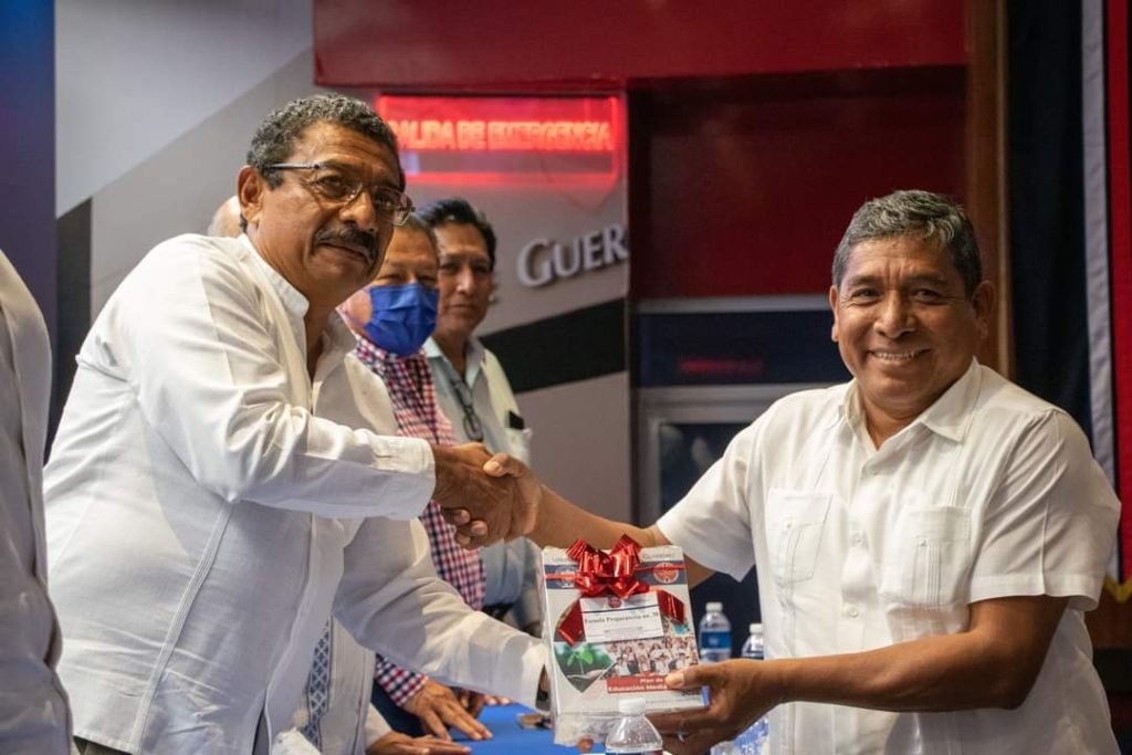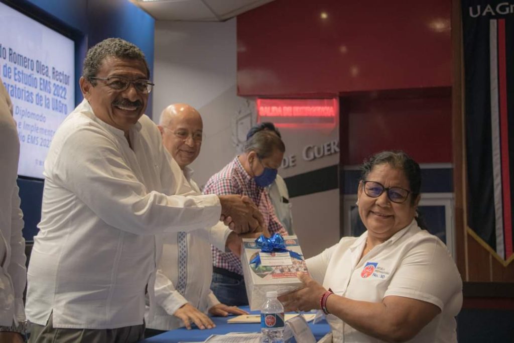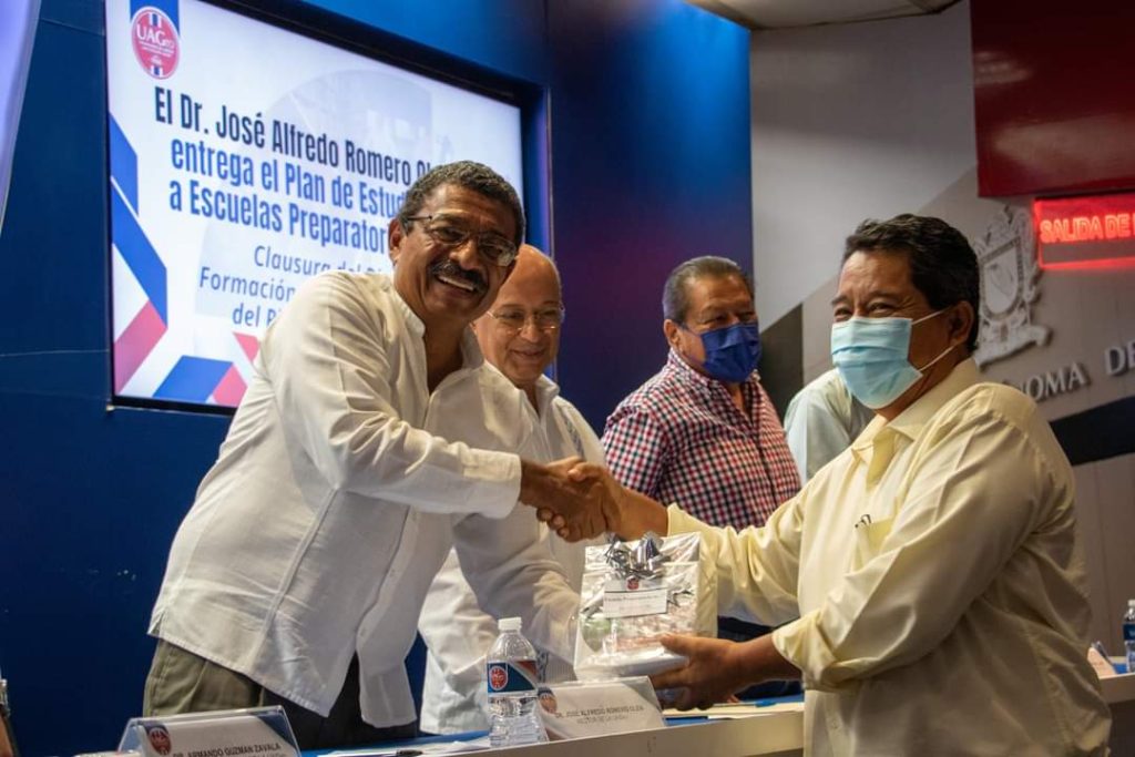 Chilpancingo, Gro., 18 de mayo del 2023.-El Dr. José Alfredo Romero Olea, Rector de la UAGro entregó el Plan de Estudios EMD 2022 a directores de Escuelas Preparatorias de la UAGro, donde ratificó que la institución está mejorando en sus procesos académicos de manera continua, siendo la UAGro la primera institución educativa en Guerrero que implementa su nuevo plan de educación superior atendiendo las políticas educativas nacionales.
