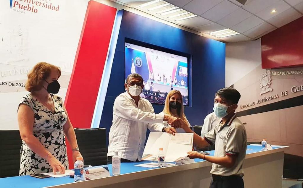 Chilpancingo, Gro. Martes 19 de julio, 2022.- El rector de la Universidad Autónoma de Guerrero, José Alfredo Romero Olea entregó el pago de las Becas Estudiantiles a jóvenes de Nivel Medio Superior que participarán en el Noveno Verano de Investigación Científica de la UAGro a realizarse en su mayoría, de manera virtual, por los efectos de la quinta ola de la pandemia del Covid-19.