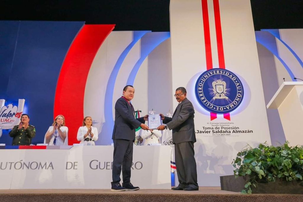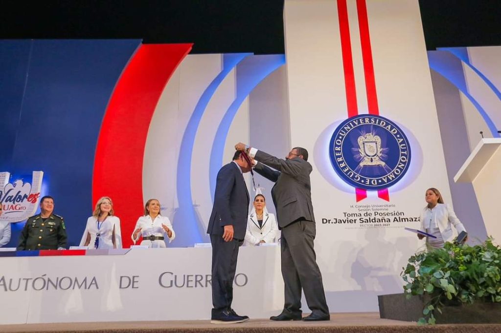 Acapulco, Gro., 27 de septiembre de 2023.-Este miércoles, el doctor Javier Saldaña Almazán tomó protesta como rector de la Universidad Autónoma de Guerrero para el periodo 2023-2027 y en su primer mensaje, ofreció a los más de 90 mil universitarios su “trabajo irrestricto y sin reservas para mantener la estabilidad institucional, impulsar el desarrollo académico y abonar a la paz y la inclusión social en el estado de Guerrero”.