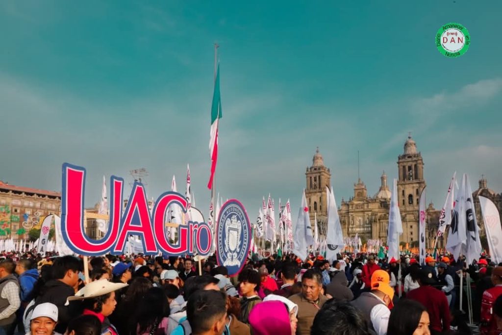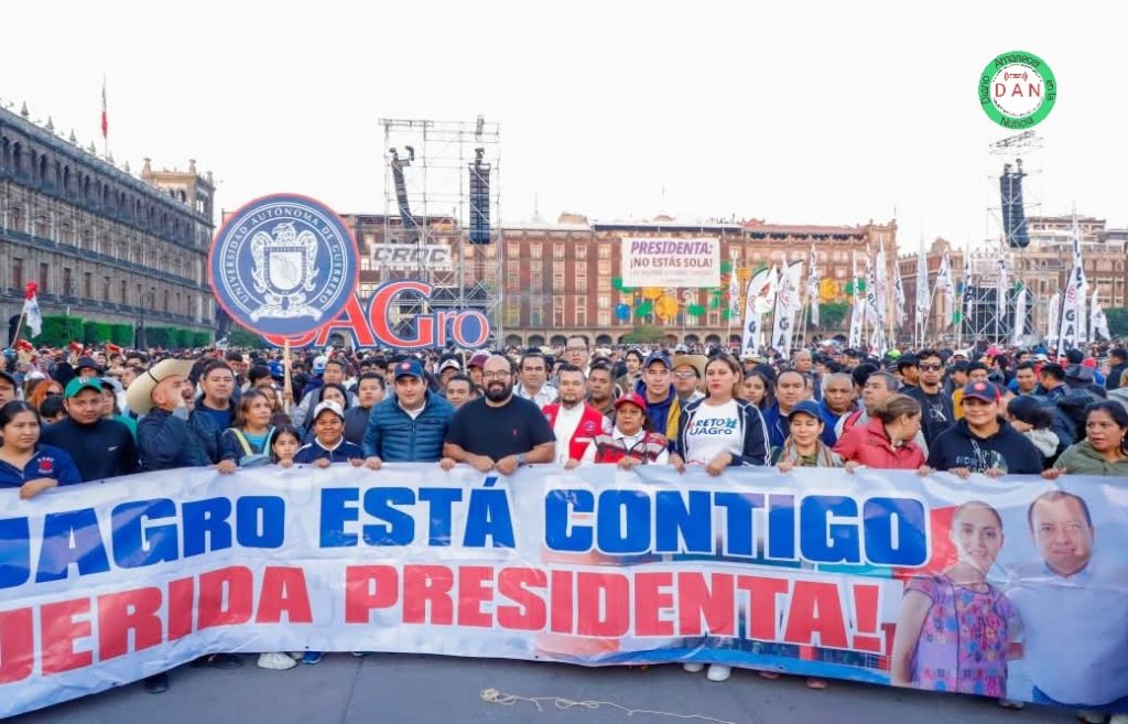 Mexico, 6 de diciembre de 2025.-La Universidad Autónoma de Guerrero no se quedó atrás desde muy temprano contingentes de Acapulco y Chilpancingo salieron para estar presentes con un nutrido contingente de catedráticos y muchos jóvenes entusiastas coordinados por liderazgos universitarios. Se les vio muy animados en su recorrido para arribar a la plancha del Zócalo de la CDMX. Recordemos que Javier Saldaña, rector de la máxima casa de estudios y líder indiscutible de la UAGro, se ha declarado en diversas ocasiones claudista de corazón; desde que la actual presidenta empezó su búsqueda por la candidatura contó con el abrumador respaldo de la UAGro, que se hacía presente cada vez que se requería.