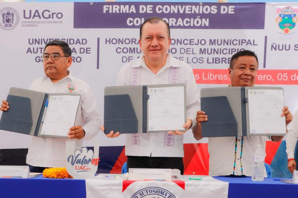 Así mismo y desde la Plaza de la Paz de Ayutla de los Libres, Saldaña Almazán firmó otro convenio con el Presidente Electo del Municipio Ñu Savi, Donaciano Morales Porfirio para expandir las actividades de vinculación de la UAGro a través de la ciencia, investigación y cultura, así como para la realización de brigadas médicas, odontológicas y psicológicas.
