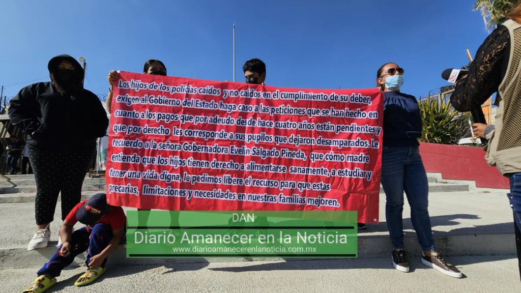 Esta mañana, dos de las cuatro esposas de los agentes que murieron algunos por enfermedad y otros en el cumplimiento de su deber protestaron con una lona en las escalinatas de la sede del gobierno estatal.