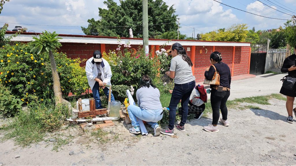 Poco antes de las 11 de la mañana, unos 30 normalistas y familiares de Yanqui Kothan llevaron a cabo un mitin en el crucero de la colonia Cuitláhuac con el antiguo libramiento a Tixtla, lugar donde quedó sin vida su compañero estudiante.