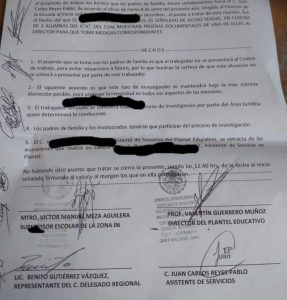 Ante las presiones de los padres por el temor de que un pedofilo esté cerca de sus hijos y de que hay más casos de acoso sexual, al director Valentín Guerrero ya no le quedó otra que darle seguimiento a tan grave acusaciones que hacían los padres contra el intendente procediendo a carear a los involucrados en una reunión donde se comprometió poner al inculpado a disposición del jurídico de la SEG, no sin antes hacer firmar a los presentes a una minuta donde los comprometía a no revelar la situación, mantener la secrecía ante los demás padres de los alumnos de la institución queriendo tapar el sol con un dedo de tan grave caso.