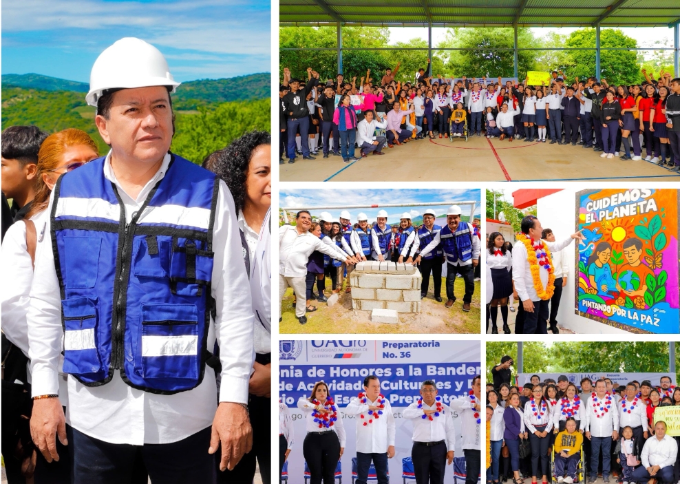 Eduardo Neri 06 de octubre de 2025.-El Dr. Javier Saldaña Almazán, Rector de la Universidad Autónoma de Guerrero (UAGro), visitó la Escuela Preparatoria No. 36 ubicada en Zumpango del Río, donde participó en la Ceremonia de Honores a la Bandera y encabezó la inauguración de actividades culturales y deportivas con motivo del 43º aniversario de la institución. Durante el evento, que contó con la presencia de autoridades universitarias y municipales, se colocó la primera piedra para la construcción de una cancha de fútbol rápido, con el objetivo de fortalecer el deporte en la comunidad estudiantil.