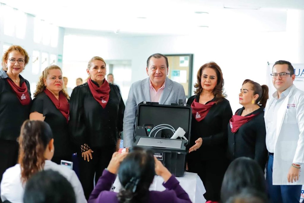 Chilpancingo, Gro., 29 de agosto de 2024.-rector de la Universidad Autónoma de Guerrero, Javier Saldaña Almazán entregó a la presidenta del Patronato del Hospital del Niño y la Madre Guerrerense, Olivia Fuentes Brito y a a la Vicepresidenta, Ma. de Jesús Pineda Echeverría, el primer Tamiz Neonatal Ocular en el estado, que ayudará a atender y detectar enfermedades o condiciones oculares en niños y niñas guerrerenses desde recién nacidos.