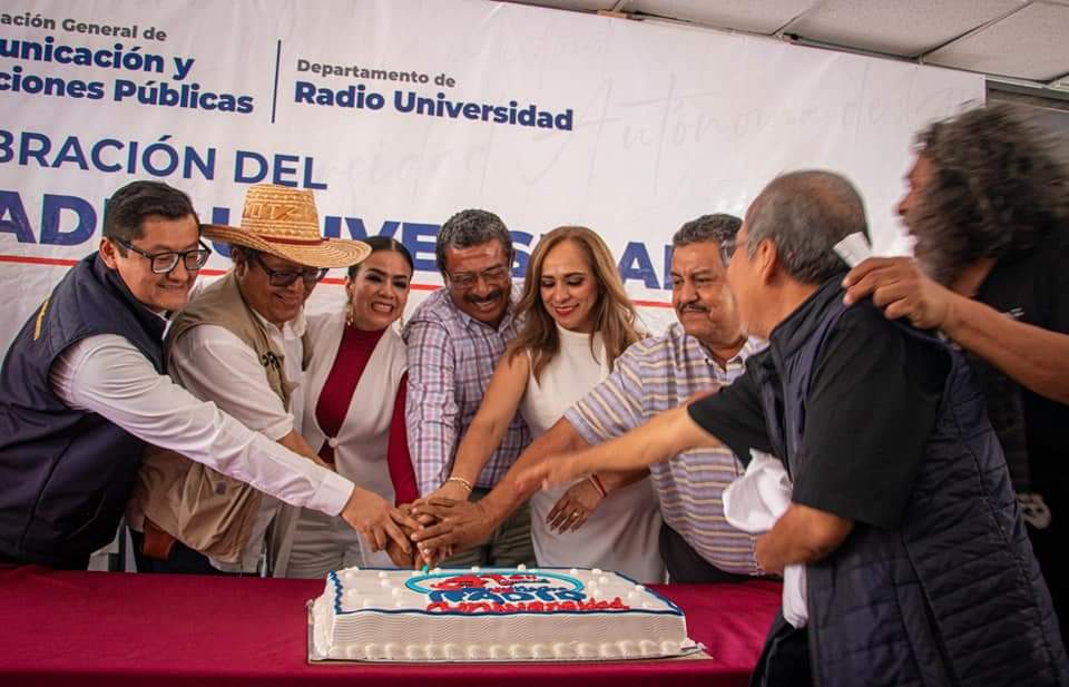 Chilpancingo, Gro., 31 de mayo del 2023.-El rector de la Universidad Autónoma de Guerrero, José Alfredo Romero Olea junto a funcionarios universitarios, municipales, del Gobierno Estatal y trabajadores asistieron al festejo realizado en la Rectoría por el 41 aniversario de la creación de Radio Universidad, a la cual los invitados les reconocieron el ejercicio pleno de la libertad de expresión, la labor periodística, social y cultural de la emisora universitaria, que a lo largo de más de 4 décadas, ha abierto sus micrófonos al pueblo guerrerense y a las causas sociales. En el acto protocolario asistieron como invitados especiales el Subsecretario de Gobierno, Óscar Chávez Rendón; la Presidenta Municipal de Chilpancingo, Norma Otilia Hernández Martínez; la Presidenta de la Codehum, Cecilia Narciso Gaytán; el Vocal Ejecutivo del INE en Guerrero, Donaciano Muñoz Loyola así como artistas, activistas, reporteros, columnistas y editores de medios de comunicación.