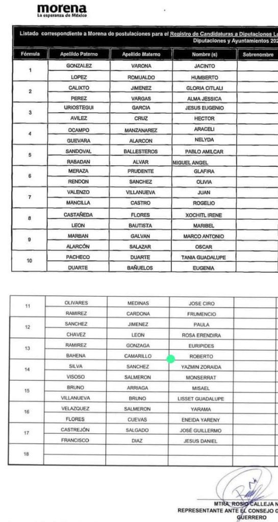 En el lugar 3 de la lista de pluris de Morena aparece Jesús Eugenio Urióstegui García; en la cuarta posición quedó Araceli Ocampo Manzanares diputada federal con licencia.